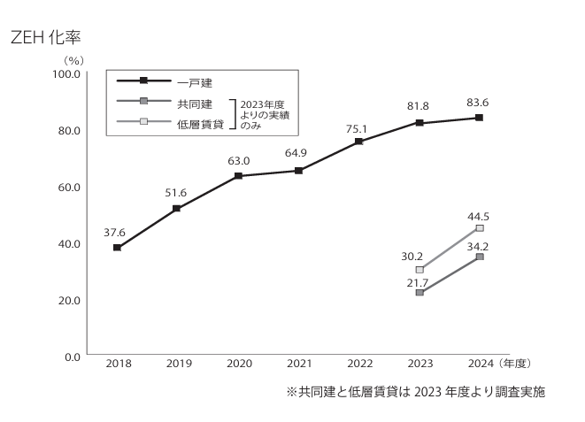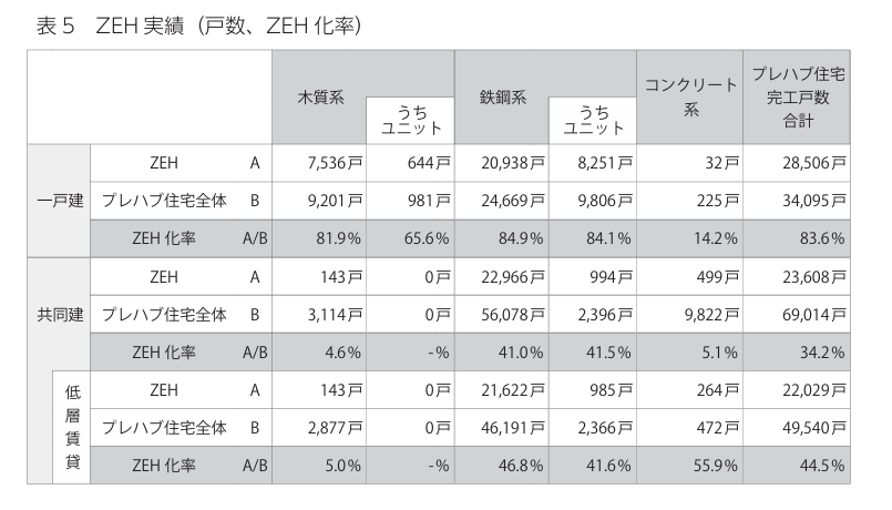 ZEHのプレハブ住宅完工戸数は5万2114戸となり、プレハブ住宅全体の50.5%と半数を占める。このうち戸建の完工戸数は2万8506戸であり、ZEH化率は前年度比1.8 ポイント増の83.6%だった。また、共同建のZEH 完工戸数は2万3608戸で、ZEH化率34.2%と12.5ポイント増えた。低層賃貸もZEH化率44.5%と前年から14.3ポイント増加した。