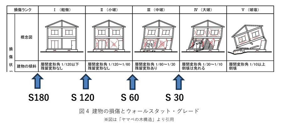 今回の機能強化版では、wallstat上で耐震性能を直感的に理解できる新たな評価指標「ウォールスタット・グレード」を導入した。これまでのwallstatではアニメーションで倒壊の有無・損傷の大きさを示していた。グレードを新たに導入することで、地震による建物の変形具合と階高の相関(層間変計角)に基づいて、建物の耐震性が瞬時にわかるようにした。損傷が軽微な状態を示す「S180」から、倒壊に至る「S30」未満まで変形の状態に応じてランク付けしている。