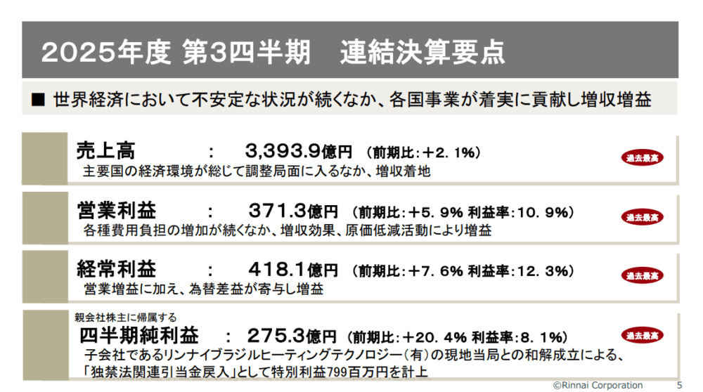 リンナイの第3四半期累計業績、売上・利益ともに過去最高