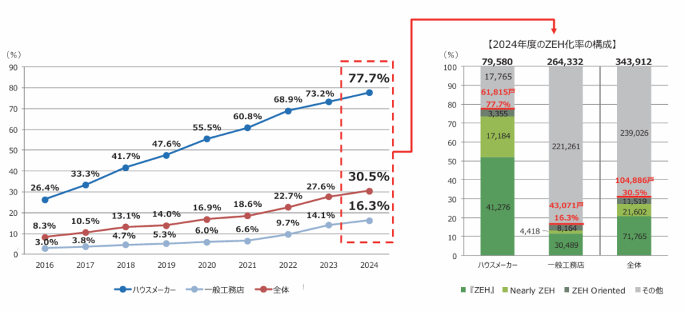 2024年度の普及実績を詳しくみると、戸建住宅全体の年間着工34万3912戸に対し、ZEHビルダー/プランナーによるZEHシリーズ(『ZEH』、Nearly ZEH、ZEH Oriented)の合計供給戸数は10万4886棟。ZEH化率は30.5%となり、前年度より2.9ポイント増加した。