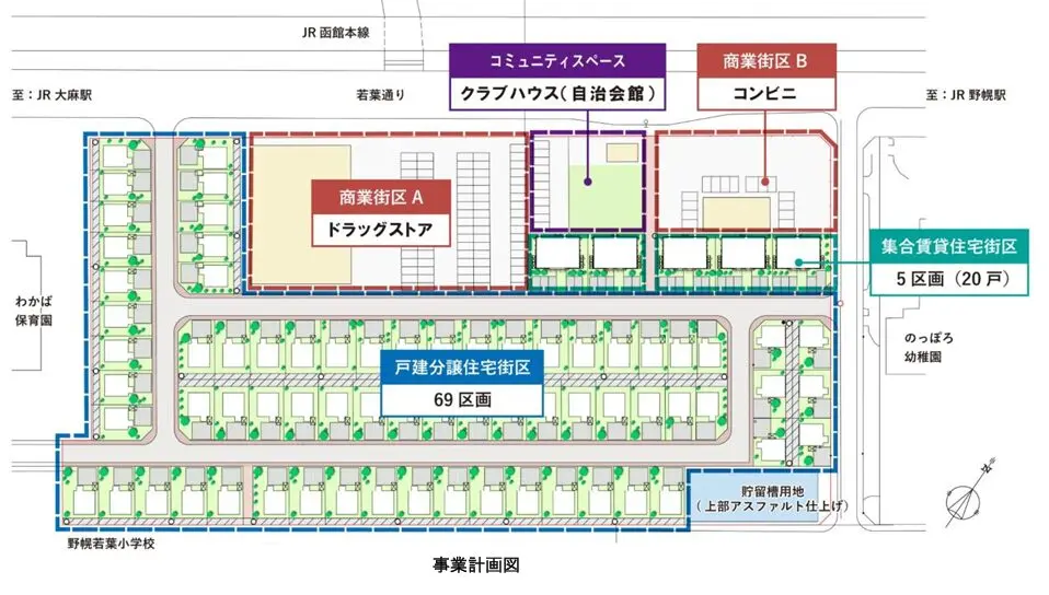 今回の開発では、JR 函館本線「野幌」駅から徒歩 8 分の立地に、戸建用宅地(69 区画)・集合賃貸住宅(全 20戸)、商業施設・クラブハウス(自治会館)といった利便施設を建築する。