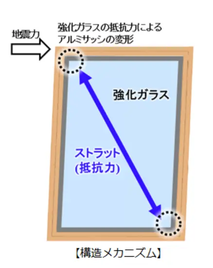 透明耐震壁の構成部材は、強化ガラスとアルミサッシの二つ。アルミサッシについては、ガラスを損傷させることなく優れた抵抗力を発揮させるために新たに開発を行った。地震時に変形を吸収するための空間もサッシ内部に設けている。