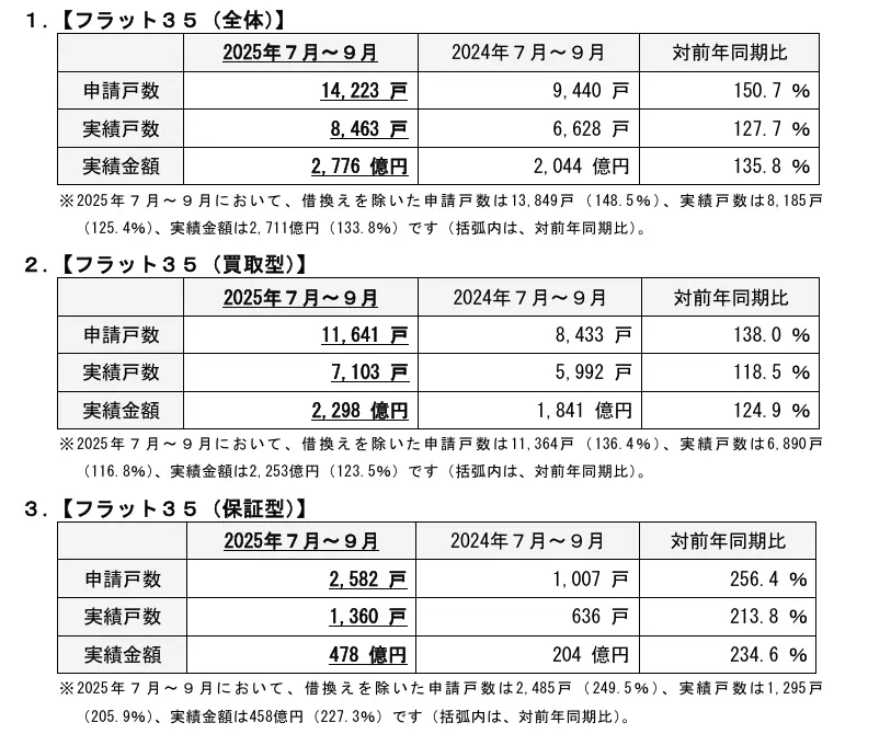 フラット35の利用者が拡大傾向にある。(独)住宅金融支援機構がこのほど公表した2025年7~9月分の利用実態によると、申請戸数は1万4223戸と前年同期比で50.7%も急増した。実績戸数も同27.7%増の8463戸、実績金額も同35.8%増の2776億円と好調に推移している。