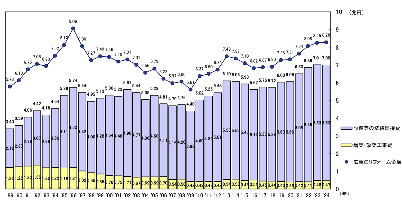 なお、リフォーム市場規模全体の7兆円にエアコンや家具などのリフォームに関連する耐久消費財、インテリアなどの購入金額を加えた「広義のリフォーム市場規模」は8兆2800億円となった。8年連続で増加しており、過去最高を更新している。