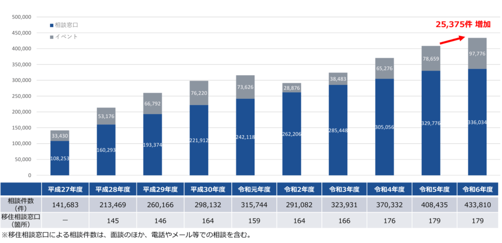 相談の内訳は、面談や電話、メールなどによる窓口での相談件数が33万6034件、イベントでの相談件数が9万7776件だった。窓口相談、イベントともに前年度より件数が増加しており、地方への移住への関心が一層高まっていることが裏付けられた。