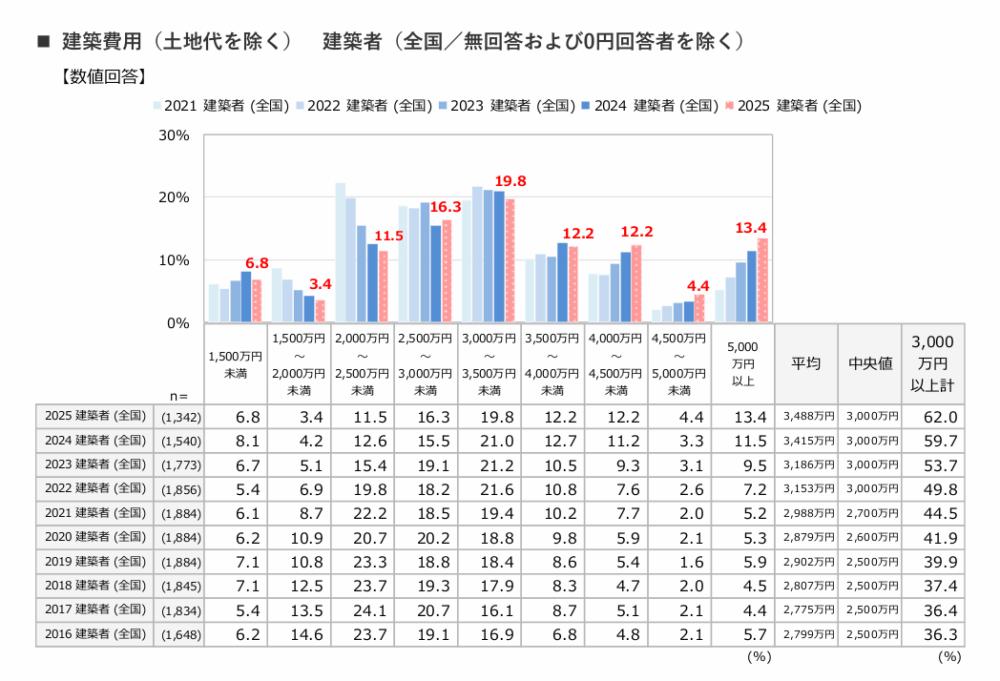建築費の内訳をみると、最も多い価格帯が「3000万~3500万円未満」で19.8%。次いで「2500万~3000万円未満」16.3%、「5000万円以上」の高級帯も13・4%で3番目に多い。3000万円以上の合計は62.0%となり、調査開始以降初めて6割を超えた。