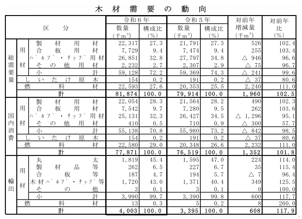 総需要量のうち国内消費は同1.8%増の7787万1000㎡。こちらでも製材と合板の需要が伸びた。また、製材については輸出も15.4%増と好調だ。