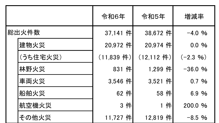 総務省消防庁の調査によれば、2024年に発生した火災件数は3万7141件で、前年に比べ4.0%減少した。このうち住宅火災は1万1839件であり、同2.3%の減少だ。