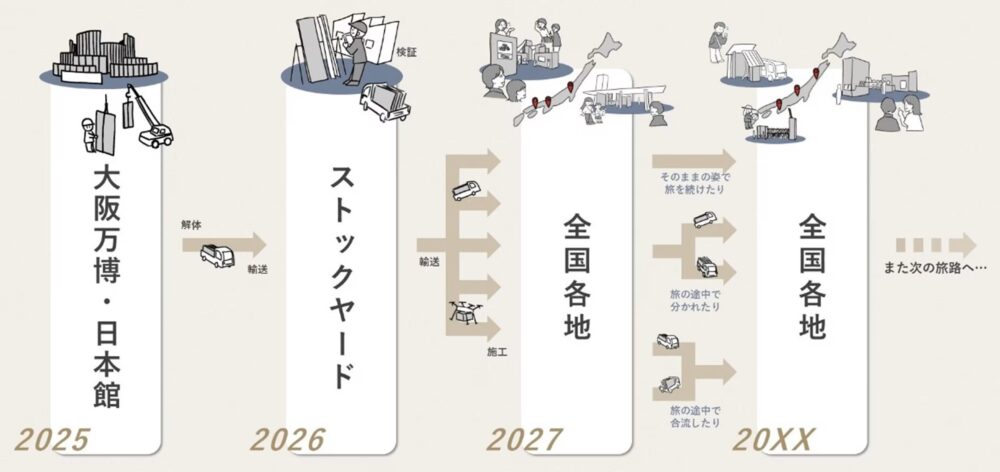 このプロジェクトは、同社が2024年12月に発表したサーキュラー建築への取り組み「循環する家(House to House)」の実現に向けた検証の一環で行うもの。日本政府館で使用されたCLTパネルを再び建材利用する。再利用は一度切りではなく、建築物の解体・再利用を複数回繰り返し、旅をするようにそれらが全国を巡回することを目指す。