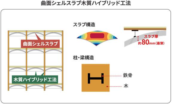 「曲面シェルスラブ木質ハイブリッド工法」は、床スラブを曲面形状とすることで、荷重を効率よく分散させる工法。一般的な集合住宅の床を支えるスラブには200mm程度の厚みが求められるが、この工法ではスラブ厚を最薄約80mm程度に抑えることができ、建築時に使用するコンクリート量の削減に寄与する。加えて、柱や梁の鉄骨を木材で被覆することで、木材利用によるCO₂低減効果も期待できる。