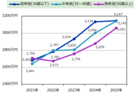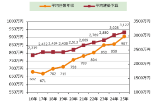 なお、建築予算と同様に平均世帯年収も2018年から上昇し続けており、今回907万円と初めて900万円台に達した。年代別では中年層が944万円でトップとなっている。若年層は885万円、熟年層は888万円で差がほとんどない。