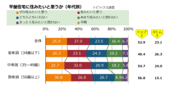 住宅購入にあたり、居住形態の意識変化も顕著となった。平屋への居住意向を聞いたところ、「ぜひ住みたい」、「住みたい」の合計は52.9%と半数を超えた。