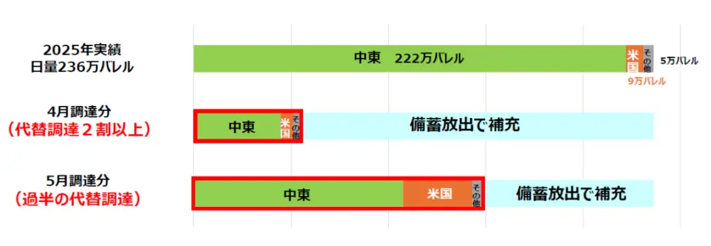 これによると、原油についてはホルムズ海峡を通らない代替ルートからの調達に最大限注力しており、4月に前年実績比で2割以上、5月には同5割以上の代替調達に目処がついたという。とくに、アメリカからは5月に前年比約4倍の原油を調達できる見込みだ。