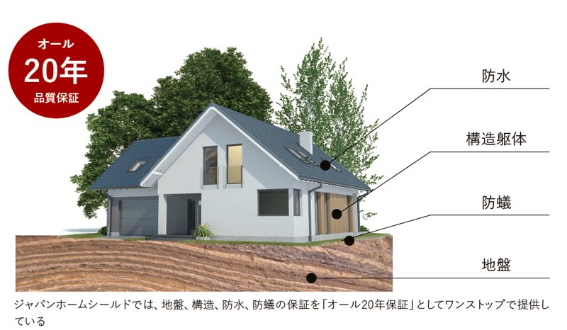 ジャパンホームシールドは、20年の地盤品質保証、20年の建物長期品質保証、20年の防蟻保証、さらに10年間の地震保証、10年の設備保証と豊富なメニューをワンストップで提供、住宅事業者と施主の長期的なつながりをサポートしている。