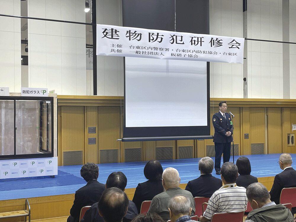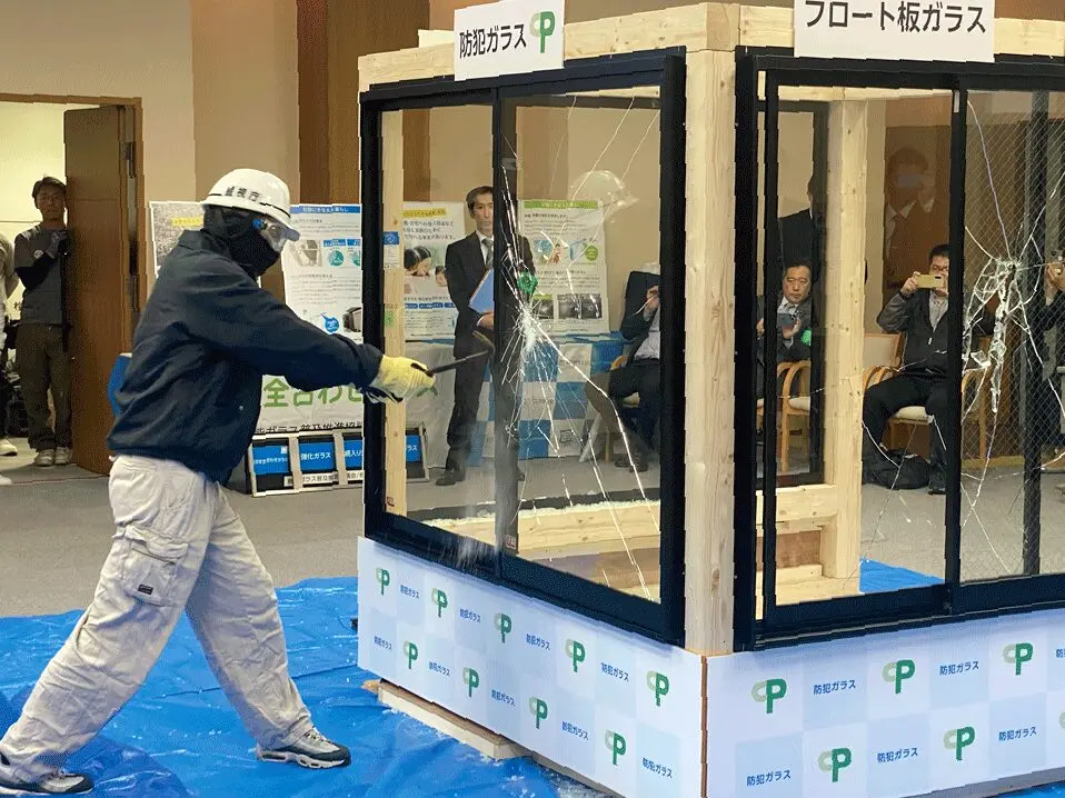 例えば、警視庁、自治体と連携して「フロート板ガラス」、「網入りガラス」、「強化ガラス」、「防犯ガラス」をバールで叩き割る実演などを行う防犯研修会を開催している。