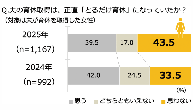 調査では、未就学時と同居する男性の育休取得率は36.3%と調査開始以来最高の数値となった。育休の動機については、育休取得希望者(1735人)が「自分の希望で自主的に取得」との項目に「あてはまる」「ややあてはまる」と回答したのがあわせて79.8%となり、「会社からの指示で取得」(42.3%)を大きく上回った。また、夫が育休を取得した女性(妻)に、夫の育休が「とるだけ育休」になっていたかを聞くと、「とるだけ育休だと思わない」(43.5%)が昨年(33.5%)より10ポイント高くなった。男性が育児に意欲的になっているものの、育休取得前の段階で「取得中に何をすればいいのか正直分からなかった」との回答は、育休取得済みの男性(1271人)の53.6%にのぼった。横山亜由美ダイバーシティ推進部長は「家事・育児にやる気のない“取るだけ”育休ではなく、意欲的だが何をすればいいか分からないという“探り”育休へと前向きな変化がみられる。また、育休中の家庭内コミュニケーションの充実度が、家事育児の満足度に影響する傾向にある」と解説。まだ男性育休の質には課題があるものの、夫婦間の対話の充実がその質の向上につながることが今回の調査で示された。