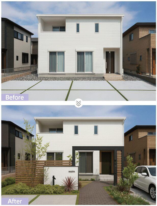 2つ目の「住宅パース生成サービス」は、手書きの立面図から住宅の3Dパースを生成するサービス。同社がこれまで外構のパース作成の依頼を受けるなかで、住宅の3Dパースの提供を求めても作っていない会社が多かったことから、サービス化に至った。生成した3Dパースを取り込んで、先述の「外構プラン合成サービス」を使えば、手書きの立面図からたった2工程で解像度の高い外構プランの提案ができる。