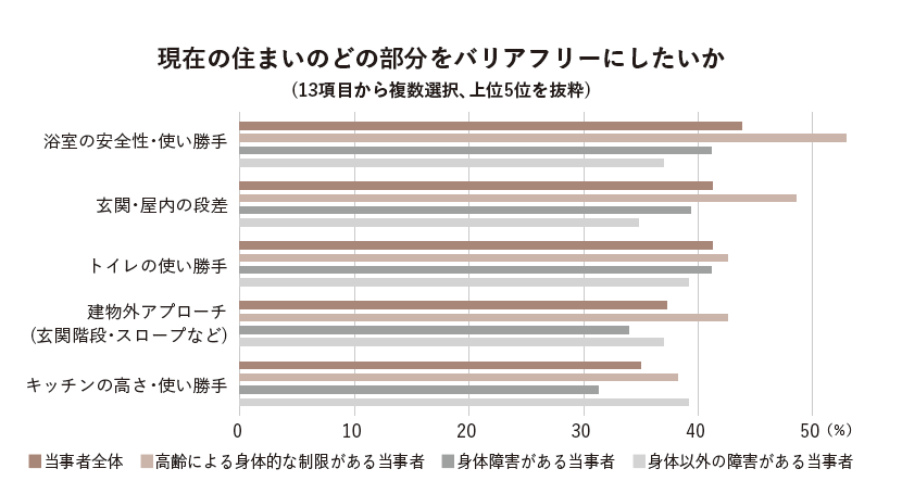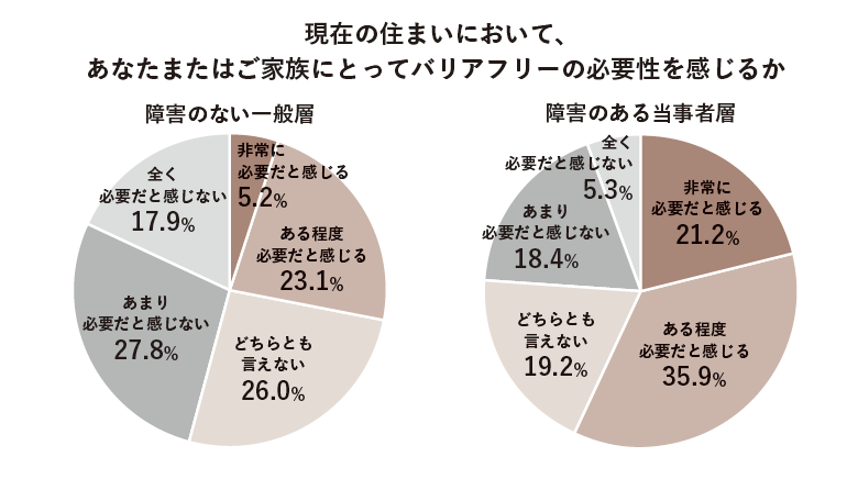 「現在の住まいにおいて、あなたまたは家族にとってバリアフリーの必要性を感じるか」の問いには、障害のある当事者層の「必要」との回答は57.1%と6割弱だが、障害のない一般層は28.3%にとどまる。ただ、一般層でも年齢の上昇とともに「必要」の割合が高まっている。当事者層が日々の生活で実際に不便や危険を体験しているのに対し、一般層はバリアフリーを「将来の備え」の一つとして検討しているため、現時点で具体的な不便さをイメージ・実感できていないと推察している。また、障害のある当事者が住まいでバリアフリー化したい部分は「浴室の安全性・使い勝手」「玄関・屋内の段差」「トイレの使い勝手」など日々の生活に関わる部分が上位。バリアフリー不足により生活に支障をきたしている箇所であり、障害によって希望する箇所に違いがある。「障害の違いによるニーズについては今後の研究でもしっかりと意識していきたい」(CULUMU・桑原寿記氏)と話す