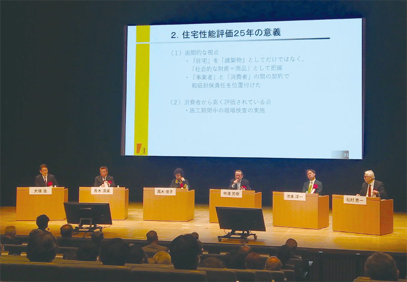 「住宅の品質確保の促進等に関する法律施行25周年記念事業実行委員会」が、同法の施行から四半世紀を迎えるのを機にシンポジウム「マイホームづくりの強い味方 住宅品確法の軌跡と展望」を開催した。松村秀一・神戸芸術工科大学学長と犬塚浩弁護士の両実行委員会会長をはじめ、和泉洋人・東京大学特任教授、青木清美氏(青木工業代表)、池本洋一氏(リクルートSUUMO編集長)、髙木佳子氏(T&Tパートナーズ法律事務所)、中澤芳樹氏((一社)住宅性能評価・表示協会会長)が登壇、同法や関連制度が果たしてきた意味や今後の展望を語った。