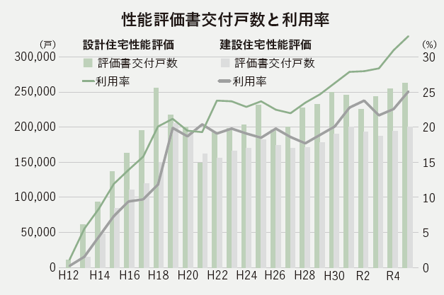 住宅性能表示制度は、この25年で着実に広がりを見せてきた。直近の24年度の評価書公布実績は、設計住宅性能評価が27万9010戸(前年比6.3%増)、建設住宅性能評価(新築)が19万1091戸(同4.1%減)、建設住宅性能評価(既存)が172戸(同23.6%減)であり、特に性能住宅性能評価の新設住宅着工戸数に対する割合は、15年度から右肩上がりを続け、22年度に30.8%と3割を超え、23年度が32.8%、24年度が34.2%と、さらに普及に加速がついている。
