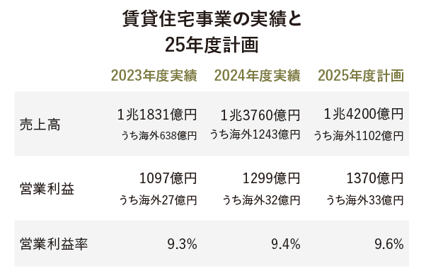 大和ハウス工業の賃貸住宅事業が好調だ。2024年度の売上高は前期比10.1%増の1兆3760億円(うち海外1243億円)、営業利益は前期比12.2%増の1299億円(うち海外32億円)だった。25年度は前期比3.2%増の売上高1兆4200億円、営業利益は同5.5%増の1370億円を計画しており、順調に達成する見込みだ。ハウジング・ソリューション本部の竹林桂太朗集合住宅事業本部長は好調の理由について「大型物件が寄与している。また、家賃上昇のトレンドにより、アパート投資が加速したともいえる」と説明する。