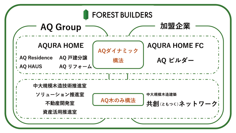 AQ Groupは2024年5月に、日本最大級の木造建築集団を目指す「フォレストビルダーズ」を結成した。「フォレストビルダーズ」には、同社のオリジナル技術「AQダイナミック構法」で戸建て住宅を建築する外部組織「アキュラホームFC」とVC「AQビルダー」がある。一方、同じく同社のオリジナル技術「AQ木のみ構法」で中大規模木造建築を担う外部組織が「中大規模木造建築 共創〈ともつく〉ネットワーク(通称:ともつくネット)」で、2025年9月にスタートした。