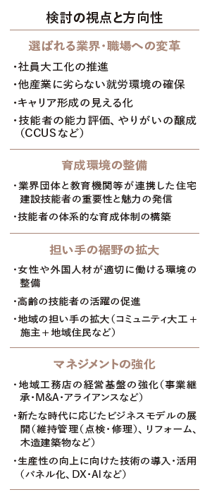 懇談会では、今後実現したい社会の姿として「他産業に劣らない就労環境の下、住宅分野の建設技能者が確保され、結果として、質の高い住まいの安定的な供給と適切な維持管理・更新が行われる社会」を目指し、大きく4つの今後の検討の視点、その方向性を打ち出した。