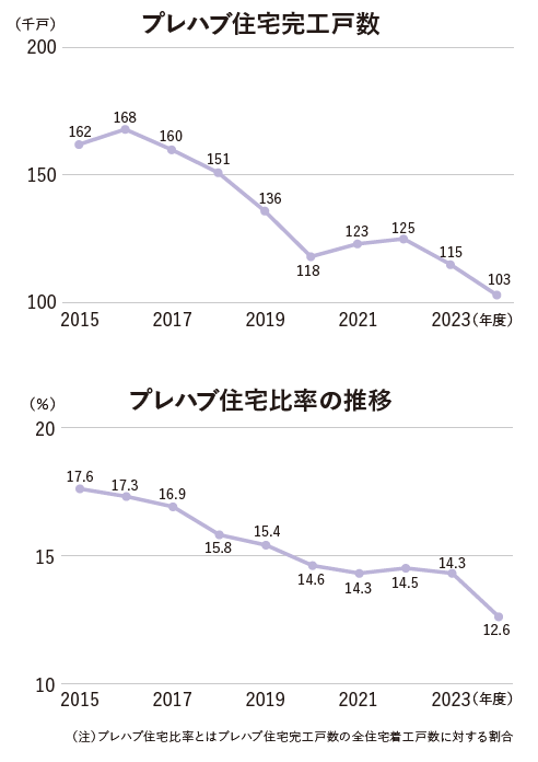 完工戸数、前年度比10.1%減の10万3109戸、プレハブ住宅比率は12.6%で2年連続減少となった。