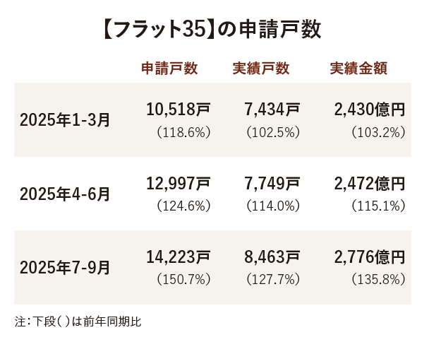 また、(独)住宅金融支援機構の【フラット50】の申請数も急拡大している。同ローンは、21年に1079件、22年に888件、23年に662件と減少傾向が続いていたが、24年は1985件へと約3倍に増加した。特に20~30歳代の利用が全体の8割弱を占めている。