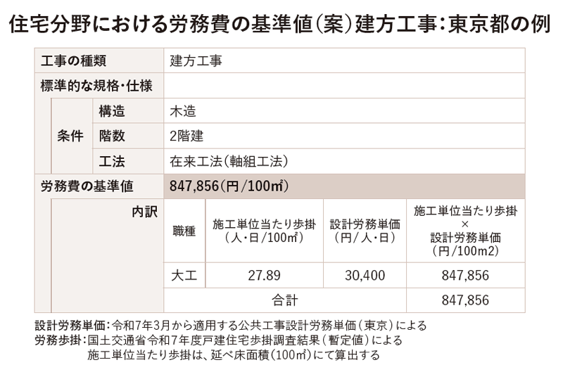 今回の法改正において、施工に通常必要と認められる費用の「下限」を設定する「標準労務費(または労務費の基準)」に関する規定が新たに設けられた。国土交通省はこれまで公共工事に限定していた技能労働者の賃金水準の目安となる「標準労務費」を、住宅を含むすべての民間工事に導入する。中央建設業審議会(建設業法に基づき国土交通省に設置された会議体)で「標準労務費」を作成・勧告できるようにした。地域や職種ごとに異なる基準値を算出、明示していく。例えば、職種分野別の労務費の基準値(案)として、木造2階建て住宅を在来軸組工法で建てる建築大工の場合、東京都では100㎡当たり84万7856円の労務費を最低限支払う必要がある。