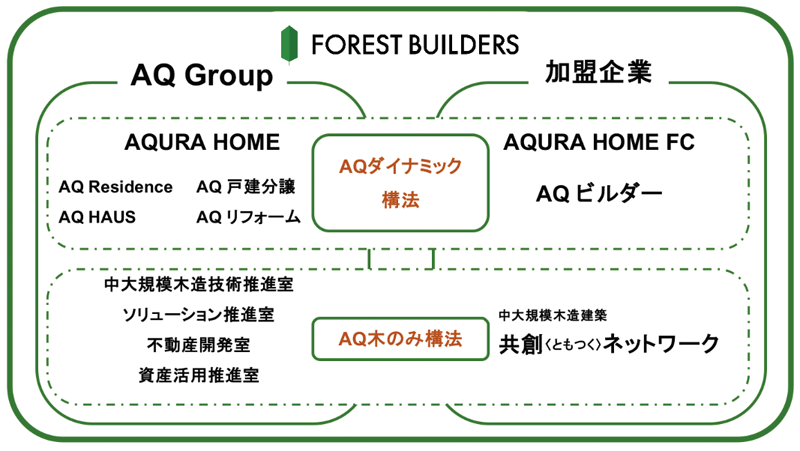 なお、当社では日本最大級の木造建築集団を目指す「フォレストビルダーズ」を組織しています。フォレストビルダーズには、「AQダイナミック構法」で戸建住宅を建築する外部組織「アキュラホームFC」と、ボランタリーチェーンの「AQビルダー」があります。そして、「ともつくネット」は、フォレストビルダーズの中でも、「AQ木のみ構法」を活用して中大規模木造建築を担う外部組織という位置づけになります。