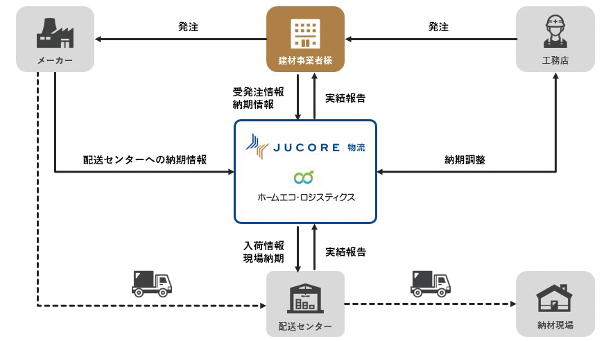 こうした課題に対して、住友林業グループのホームエコ・ロジスティクスは、建築現場配送の効率化を実現するJUCORE 物流を開発し、2024年1月から首都圏一都三県で事業を開始した。商物分離や、物流網の小半径、高積載、高回転をコンセプトとしたラストワンマイルの共同配送、工程に応じた配送計画で建材流通業者や工務店、建材メーカーなどの物流負担を軽減し現場の生産性を向上する。建材流通の「配送リソースの最適化」や「配送コストの削減」を実現し、受注から納品まで建材流通の課題を解決する革新的なサービスだ。