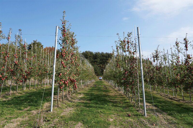 栽培方法は「高密植栽培」を採用する。イタリア発祥で世界的に主流となってきている栽培方法で、収益性、効率化を高めることができる。一本一本の樹を細く仕立て面積当たりの定植本数を増やすことで平均収穫量を1反当たり約6トンと、日本で広く採用される栽培方法に比べて約3倍の収穫が可能となる。樹を一直線に並べて植えることでシンプルな作業動線を活かした機械化など、定植や収穫などの作業負担の軽減も図ることができる。また、定植2年目からの収穫が可能で早期多収であることもポイントだ。日本農業では青森県で高密植栽培での実績を持つ。