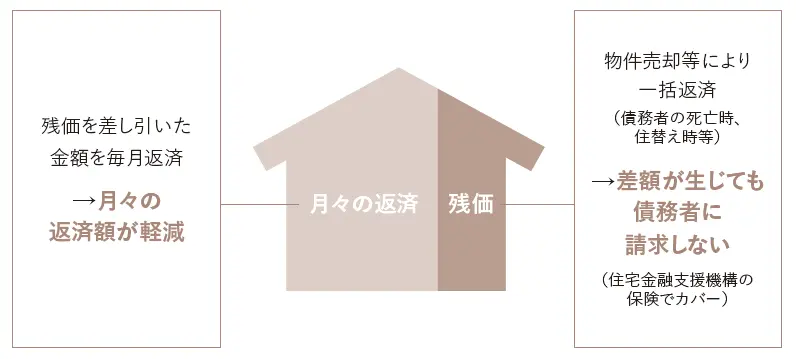 通常のローン(元利払い)とリバースモーゲージ型住宅ローン(利払い)を組み合わせた融資で、死亡時のほか住宅売却時にも残価部分を債務が残らないノンリコースとし、差額が生じても住宅金融支援機構の保険でカバーする。