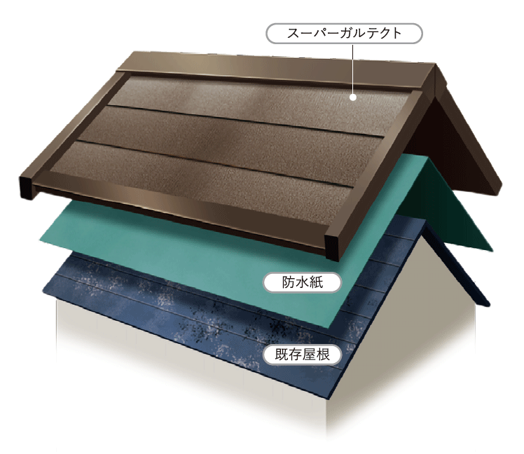 また、遮熱性鋼板と断熱材を一体成型にすることで、遮熱と断熱のW効果で夏は涼しく、冬は暖かい快適な住まいを実現できる。表面塗装に「遮熱性フッ素樹脂塗装/遮熱性ポリエステル樹脂塗装」を採用し大きな遮熱効果を発揮する。芯材には断熱性、防火性に優れたポリイソシアヌレートフォームを採用、複雑なかん合部まで充填する。試験により「スーパーガルテクト」でカバー工法した場合、通常の塗装リフォームよりも屋内側温度を約15℃下げることを確認している。