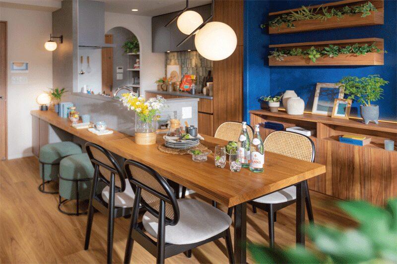 他にも住まい手の暮らしやすさを配慮した様々な仕様をそろえた。キッチンとダイニングテーブルを一体化した同社の売りである「ピアキッチン」には、樹齢250~300年相当のドイツ製オーク材を採用。職人が手仕事で仕上げた一枚木のテーブルが空間を引き立てている。キッチンには、床から天井まである大型食器棚やシンク下に移動式のごみ箱を設置するなど、すっきり収納できる工夫を散りばめた。また、キッチン背面の作業台には昨今の電化製品の数に合わせ、4つのコンセントを用意した。