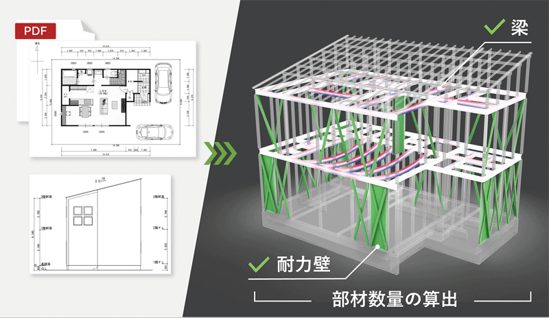 同サービスの画期的な点は、「PDF形式の図面」を直接読み込んで解析できる点にある。従来のCAD連携では、ソフト間の互換性やデータ項目の不足が壁となり、自動化が困難であった。これに対して同サービスでは、最も普及している意匠図面(平面・立面・屋根伏図)のPDFからAIが柱や壁、梁の配置を学習・認識できる機能を備えた。これにより、特定のCADソフトに依存せず、あらゆる加盟店が図面をアップロードするだけで利用できるようにした。
