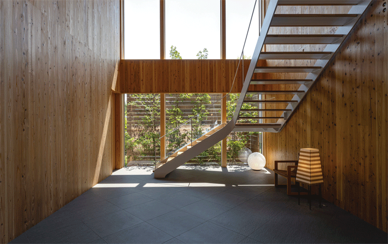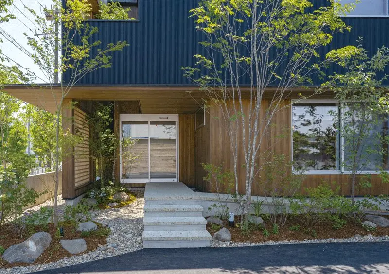 「全部を木にするとメンテナンスが大変ですが、ガルバリウムと組み合わせることで耐久性を確保しつつ、木の温かみを視覚的にアピールできます。植栽についても、造園家の荻野寿也氏に依頼し、雑木の庭を抜けて森の中から建物へ入っていくようなエントランスを演出しました」。