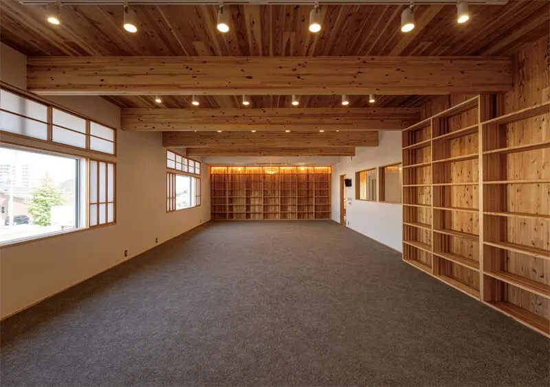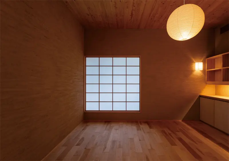 内装はCLTを極力見せるデザインとし、前川氏が敬愛する建築家、吉村順三の建築などを参考にして、障子などの日本建築要素も取り入れている。