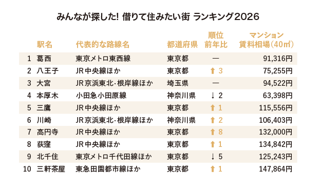 「借りて住みたい」ランキング(駅)は、葛西(東京都江戸川区)、八王子(東京都八王子市)、「大宮」(埼玉県さいたま市)がトップ3。4位以降は本厚木(神奈川県厚木市)、三鷹(東京都三鷹市)、川崎(神奈川県川崎市)、高円寺(東京都杉並区)、荻窪(東京都杉並区)、北千住(東京都足立区)、三軒茶屋(東京都世田谷区)という順になった。