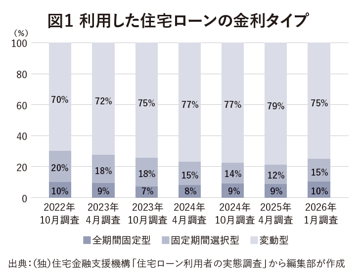(独)住宅金融支援機構の「住宅ローン利用者の実態調査(2026年1月調査)」によると、利用した金利タイプは「変動型」が75.0%と最も多いが、25年4月の前回調査から4.0ポイント減少した。代わって増加した「固定型」は、「全期間固定型」が10.1%(同1.3ポイント増)、「固定期間選択型」が14.9%(同2.7ポイント増)だ。7割を超える人が「今後1年間で住宅ローン金利は上昇する」とみていることから、固定金利型人気が高まりつつある(図1)。