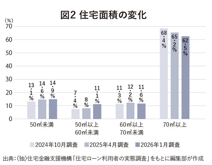 先の(独)住宅金融支援機構の調査における物価高・住宅価格高騰の影響の3位にあげられたのが「建物の広さ・階数・築年数を見直した」(14.7%、同3.8ポイント増)であり、住宅価格高騰のなか住宅を小さくして価格を抑えようという動きが広がっている。同調査で取得した住宅の広さをみても70㎡以上の割合は24年10月調査から徐々に減少傾向にあり、代わって50~60㎡未満と50㎡未満の割合が高まりつつある(図2)。
