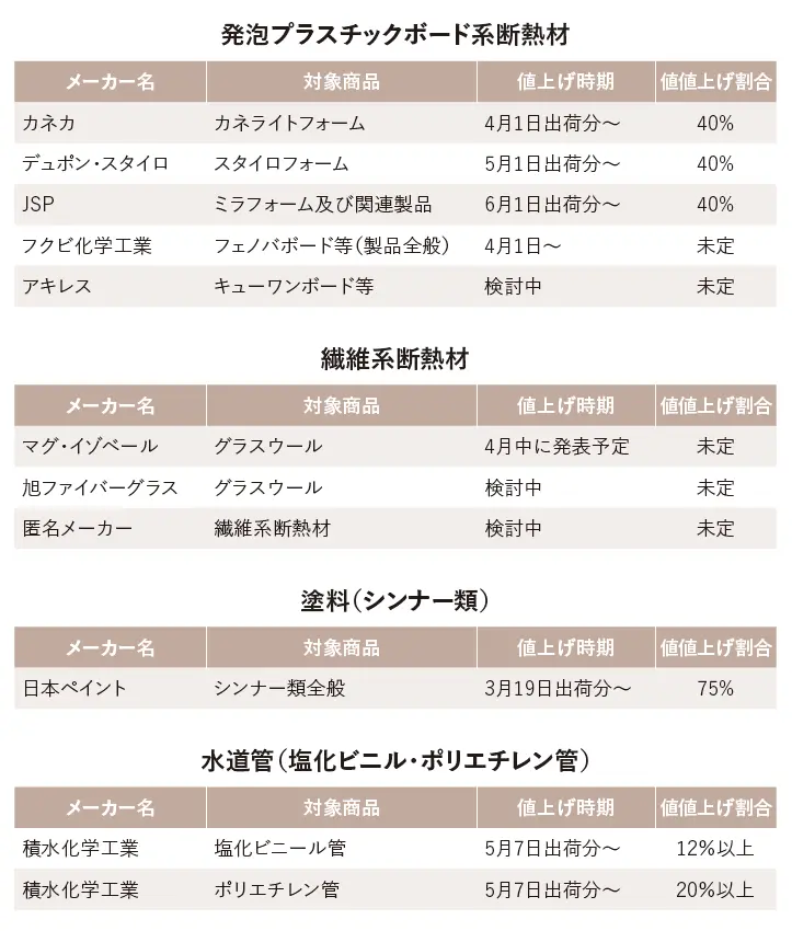 中東情勢の緊迫化に伴うホルムズ海峡の事実上の封鎖懸念や、原油価格の爆発的な高騰を受け、住宅建材においても多くのメーカーが「大幅値上げ」を相次いで発表している。特に原油・ナフサを主原料とする、ポリスチレン、ウレタン、フェノール樹脂などの発泡プラスチックボード系断熱材は、これまでにない規模の改定の動きが出てきている。