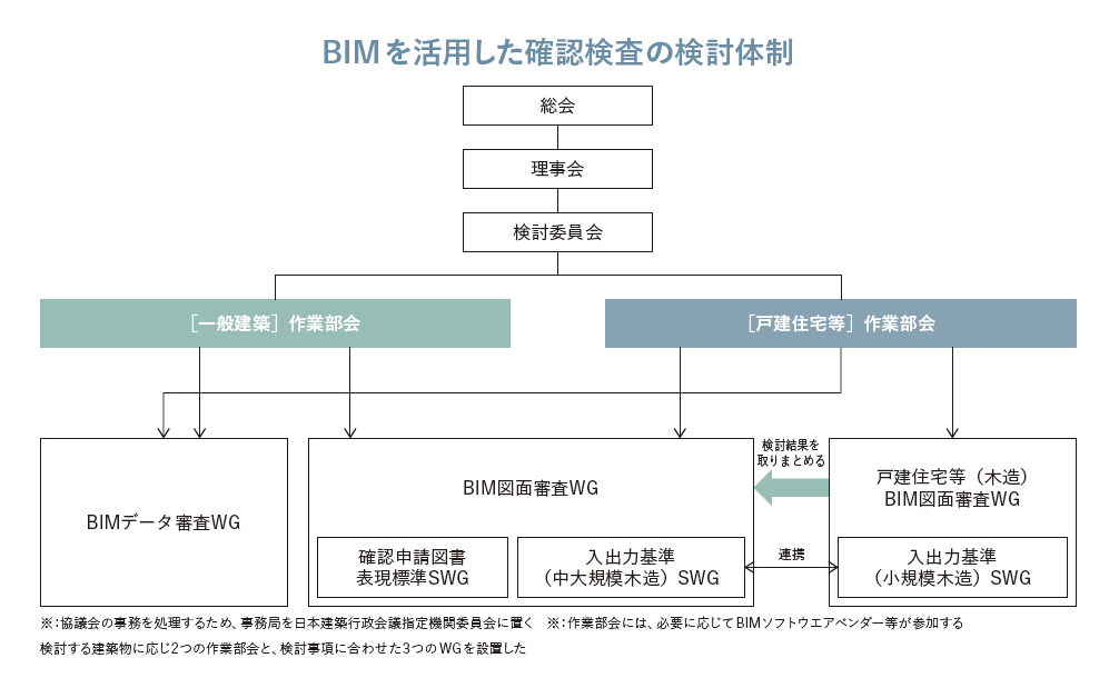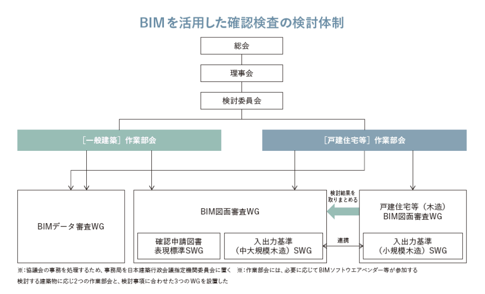 このため、国土交通省は「建築確認におけるBIM活用推進協議会」の下に「部会3:BIMを活用した建築確認 検査の実施検討部会」を設置し、さらに木造建築に特化した「戸建住宅等(木造)BIM図面審査WG」および「入出力基準(小規模木造)SWG」といった組織を立ち上げた。