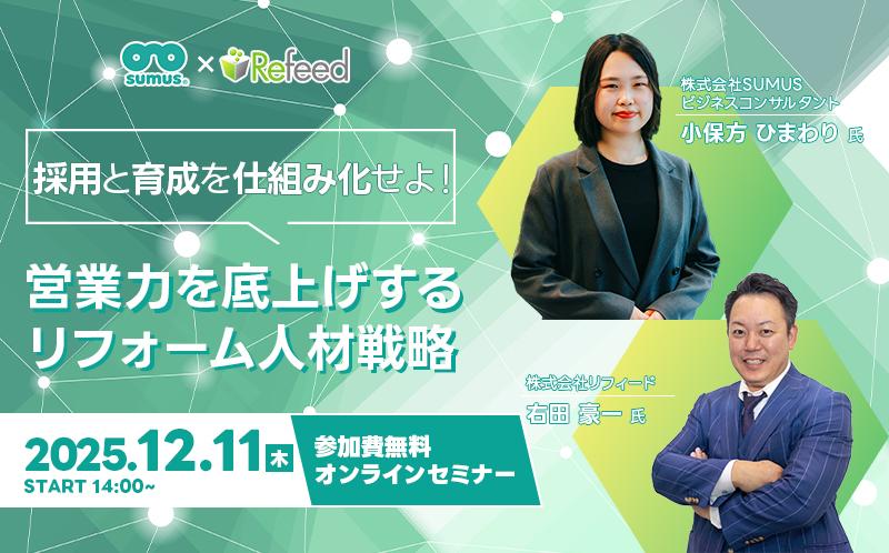 リフィードは2025年12月11日(木)に、「採用と育成を仕組み化せよ!営業力を底上げするリフォーム人材戦略」と題し、無料のオンラインセミナーを開催する。