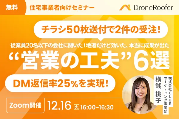 本セミナーでは、従業員20名以下の住宅・塗装・工務店などの事業者様が、実際に取り組み、本当に成果が出た「返信率25%を実現した、定期点検DMの工夫」や「初めてのチラシで10件以上の問合せを獲得した配布方法」など“営業の工夫”6つを紹介する。
