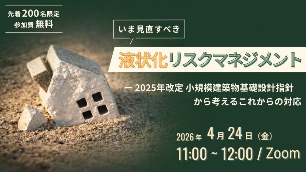ジャパンホームシールドは、2026年4月24日にオンラインセミナー「いま見直すべき 液状化リスクマネジメント ─ 2025年改定 小規模建築物基礎設計指針から考えるこれからの対応」を開催する。