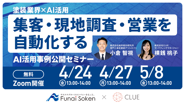 CLUEは、4月24日、4月27日、5月8日に塗装業界向けに集客から現地調査、営業までを自動化するAI活用事例を紹介するオンラインセミナーを開催する。