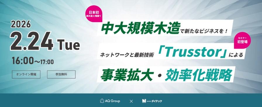 AQ Groupとダイテックが共催で、2月24日に「中大規模木造で新たなビジネスを! ネットワークと最新技術「Trusstor」による事業拡大・効率化戦略」と題したオンラインセミナーを開催する。