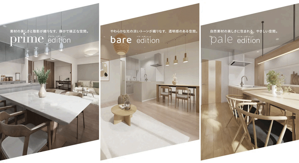 東急Re・デザインはマンションリノベーション・パッケージRe_edit(リエディット)の提供を開始した。プロが厳選した上質な内装をベース仕様として提供し、使い手が家具やアート、観葉植物などで自由に彩りを加え、日々の暮らしを豊かに“編集”していくというコンセプトで、新しい住空間のあり方を提案する。静かで端正な空間のprime(プライム)edition、アースカラー空間のbare(ベア)edition、淡いトーンでまとめたpale(ペール)editionの3つをそろえる。